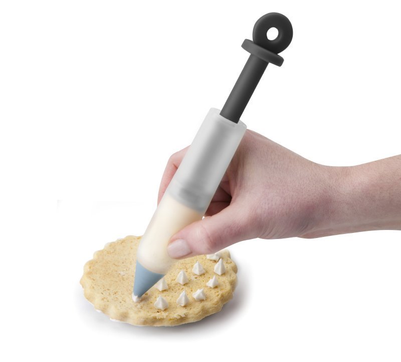 S touto tužkou značky Ibili zvládnete snadno i složité zdobení perníčků. Zdobící tužka je pevná, takže se na rozdíl od sáčků nekroutí a množství vytlačované polevy či krému máte vždy pod kontrolou díky pístu. Délka tužky: 12 cm. Materiál: plast.