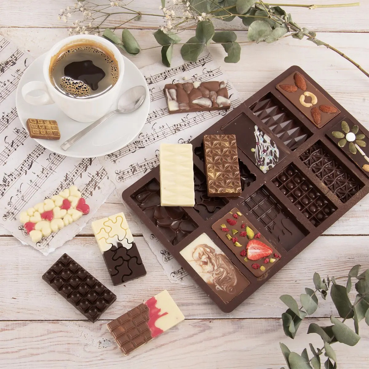 Stačí rozpuštěnou čokoládu nalít, přidat ořechy, sušené ovoce, sušenou levanduli nebo netradičně chilli či pepře a nechat ztuhnout v ledničce. Jednotlivé čokoládky z pružné formy jednoduše vyloupnete, případně poprášíte metalickým jedlým pudrem, aby vypadaly opravdu luxusně. Uvidíte, že budou i skvělým dárkem pro milou osobu, partnera, maminku apod. 1 tabulka má rozměr cca 7x3,5 cm.